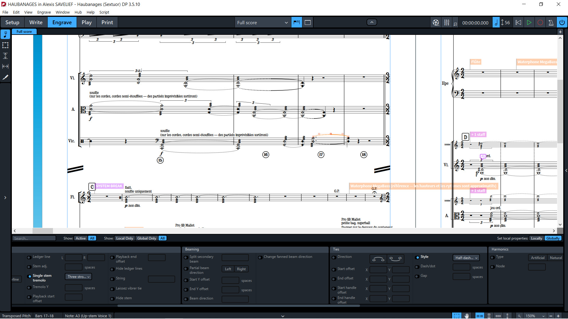 Après avoir préparé plusieurs matériels de pièces contemporaines et de grosses pièces d’orchestre (conducteur de près de 250 pages, matériel de pratiquement 800 pages), je dois être franc et dire que si globalement le travail est largement plus rapide que dans d’autres logiciels de notation musicale par bien des aspects, les limitations dont j’ai parlé tout au long de cet article m’ont parfois fait perdre beaucoup de temps. Notamment ces histoires de propriétés à propager et re-propager et mes divisions de cordes souvent complexes. Il en va également de ma faute, parfois par manque de plannification (initialement je n’avais pas défini les tucking index des modes de jeu), parfois à cause du temps qui m’a été nécessaire pour apprivoiser certaiens fonctionnalités que je n’avais pas encore utilisées et que j’ai découvertes sur le tas (la condensation, par exemple).